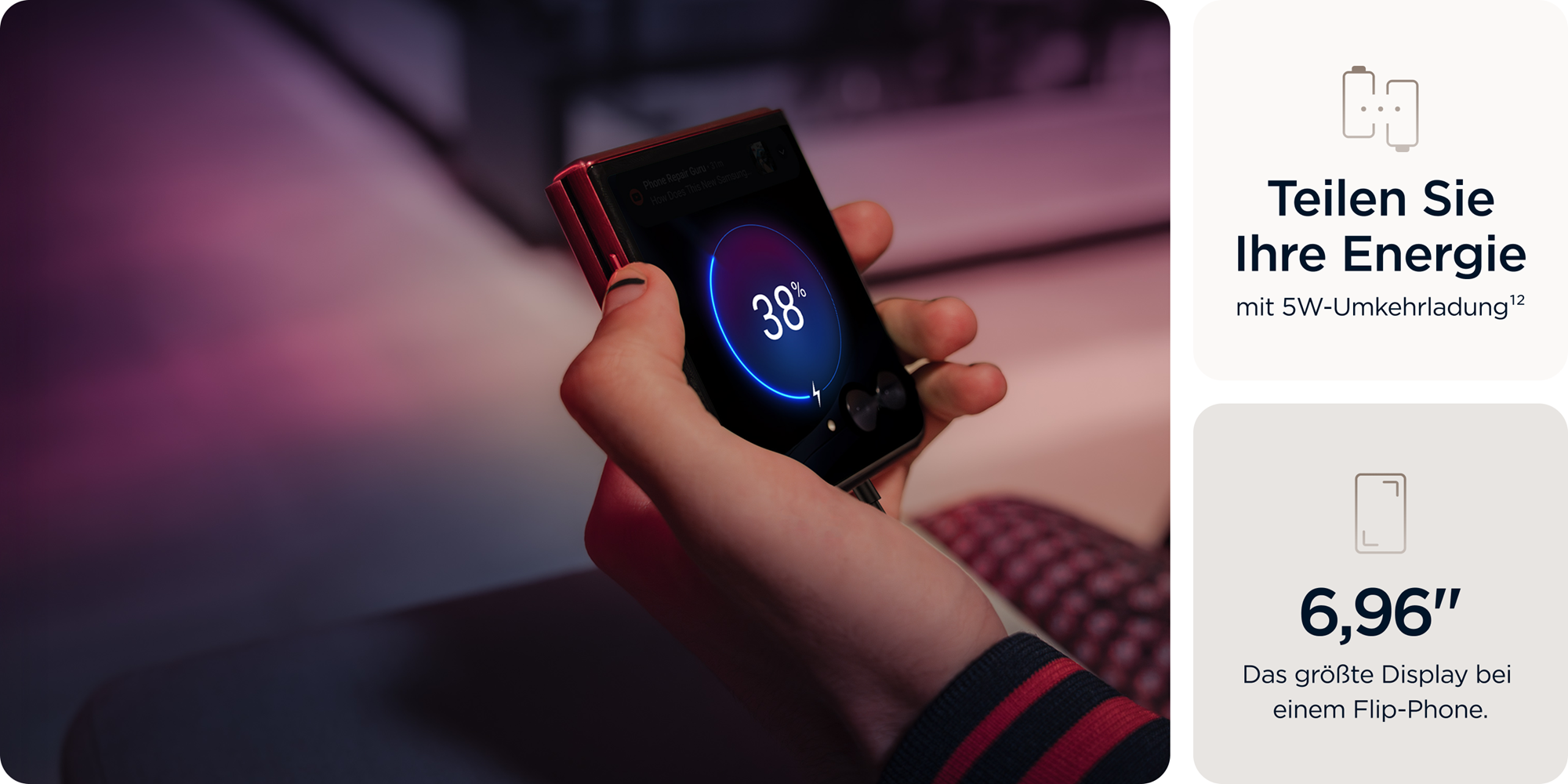 The fastest charging flip phone. Get power for the day in just 8 minutes with 68W TurboPower™ charging, and over 36 hours of battery life.